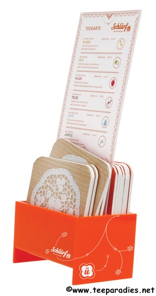 Teedeckelhalter aus Plexiglas, mit Einsteckfach für individualisierte Karte. Der Schlürf Tee Deckelhalter ist sehr dekorativ. H 62 × B 102 × T 77 mm