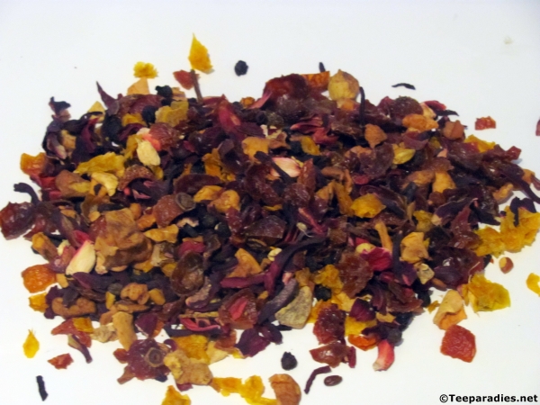 Zutaten: Hibiscusblüte, Hagebuttenschale, Apfelstücke, Sanddornbeeren geschnitten, Holunderbeeren und Ingwerstücke. Ohne Aroma.