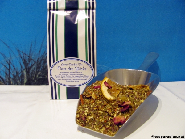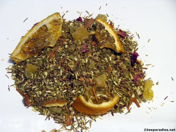 Grüner Rooibostee, Mangostücke, Orangenecken, Rotsandelholz, Orangenschalenstücke, Rosenblüten, Aroma