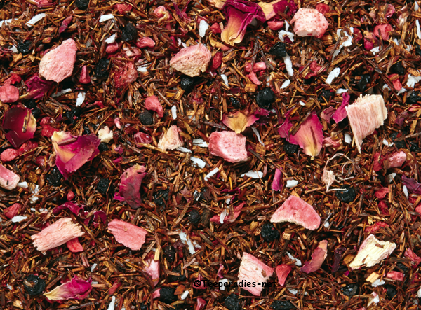 Zutaten: Rotbuschtee, Fliederbeeren, Kokosraspeln, Aroma, gefr.-getr. Himbeerstücke, Rosenblüten, gefr.-getr. Rhabarberstücke